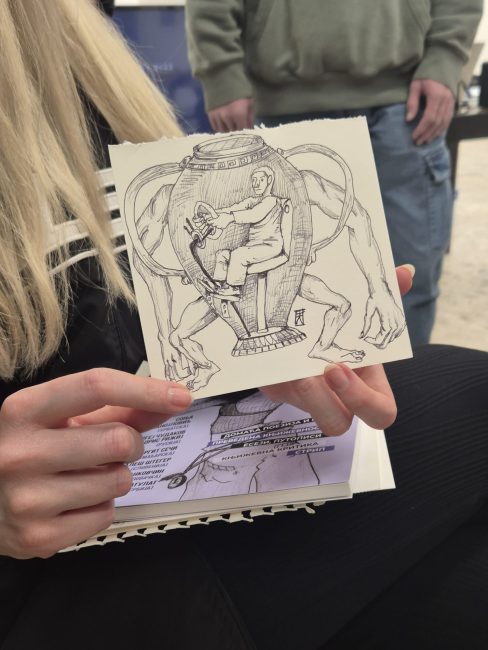 The Gallery of Contemporary Art in Pančevo turned out to be a truly perfect place for the workshop, considering that it currently hosts an exhibition showcasing four decades of Aleksandar Zograf’s work. The exhibition covers a wide variety of Zograf’s pieces, from his earliest drawings, episodes from the Pančevo flea market, dreams, and travelogues, all the way to comics he has published in Japan, America, and China. Naturally, it also reflects another important legacy of Aleksandar Zograf: his idealistic and activist work in creating and maintaining local, regional, and international networks of comic creators and lovers of this art. This network is now open to Bim Eriksson as well.